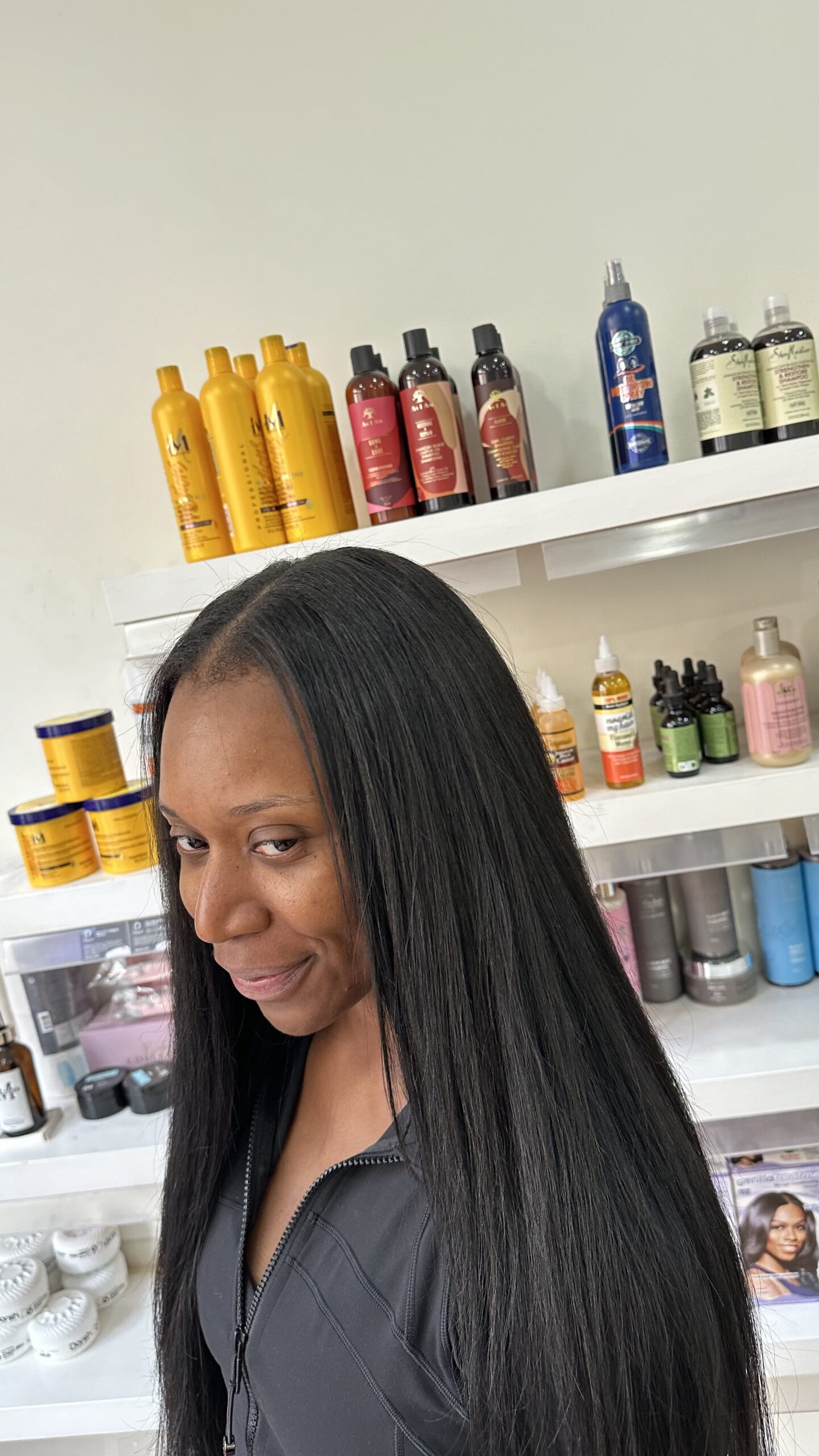 Your hair is braided with a little amount left out in front, for a more natural look. Just good enough to give the desired result of the chosen style that suits you. Then an average of 200 grams of raw hair extensions or more is sewn in and styled for best result.